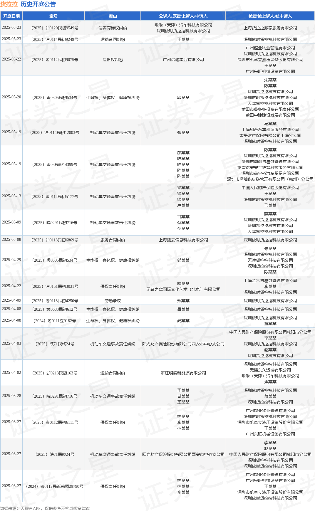 案号:(2025)粤0114民初5177号审理法院:广州市花都区人民法院案由:机动车交通事故责任纠纷当事人信息: 原告/上诉人:梁某某、梁某某、梁某某、卢某某 被告/被上诉人:中国人民财产保险股份有限公司、王某某、深圳依时货拉拉科技有限公司、马某某开庭日期:2025年5月13日根据统计,近一年内以深圳依时货拉拉科技有限公司为当事人的历史开庭公告有86则,其中案由为“机动车交通事故责任纠纷”的公告以40则居首,其次为“运输合同纠纷”有9则,“侵权责任纠纷”有8则。历史开庭公告(前20条)如下: